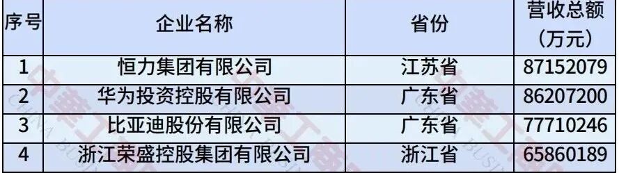 此次民营企业500强入围门槛增至270.23亿元;营业收入总额达到43.05万亿元;净利润合计1.80万亿元;研发费用总额1.13万亿元,研发人员总数115.17万人,平均研发经费投入强度2.77%;纳税总额达1.27万亿元,纳税额超过10亿元的企业有240家,占500强比例为48.00%。